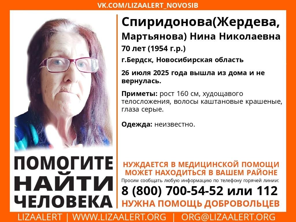 Женщина бесследно исчезла 26 июля. 26 июля 2025 года вышла из дома и не вернулась Нина Николаевна Спиридонова (Жердева, Мартьянова), проживающая в Бердске. Приметы: рост 160 см, телосложение – худощавое, волосы – каштановые, крашенные. Глаза – серые. По поводу одежды информации нет. Волонтеры поискового отряда "ЛизаАлерт" просят всех, кто видел Нину Николаевну или располагает какой-либо информацией о ее местонахождении, незамедлительно сообщить по телефонам горячей линии 8-800-700-54-52 (бесплатно по РФ) или 112. Родственники и близкие Нины Николаевны не теряют надежды и обращаются ко всем неравнодушным с просьбой о помощи. Любая, даже самая незначительная информация, может оказаться решающей в этой непростой ситуации.