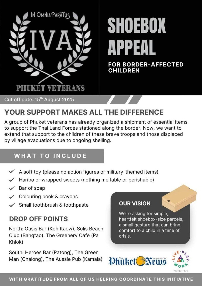 Помощь детям, эвакуированным из зоны приграничного конфликта Ассоциация ветеранов Пхукета (Phuket Veterans, пхукетское отделение IVA) собирает большую посылку от пхукетчан для детей из приграничных районов Таиланда, эвакуированных после эскалации тайско-камбоджийского конфликта. Ранее члены Phuket Veterans уже отправили вещи первой необходимости тайским солдатам на границе. Вторая посылка предназначена гражданским лицам, перемещенным из ставших опасными районов – прежде всего детям. Phuket Veterans приглашают всех желающих присоединиться. Как собрать посылку? Размер посылки не регламентирован в сантиметрах, но ориентировочно – как коробка для обуви. Желательно пометить посылку как «для мальчика», «для девочки» или «универсальная». Каждая коробка будет передана напрямую ребёнку. Что положить в коробку? 📦 Маленькая плюшевая игрушка (идеальны Moshi Moshi, стоят ~180 бат) 📦 Любая другая небольшая игрушка, кукла Барби или фигурка супергероя (пожалуйста, не кладите никакие военные иг