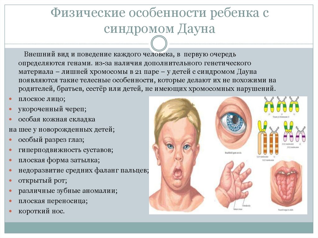 Синдром Дауна возникает, когда в клетках человека присутствует не две, а три копии 21-й хромосомы — это состояние называют трисомией 21. Избыточный генетический материал приводит к широкому спектру нарушений: от врождённых пороков сердца до трудностей с обучением и речью.