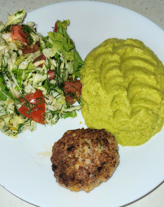Завтрак с пюре из цветной капусты и брокколи с котлетой и салатом