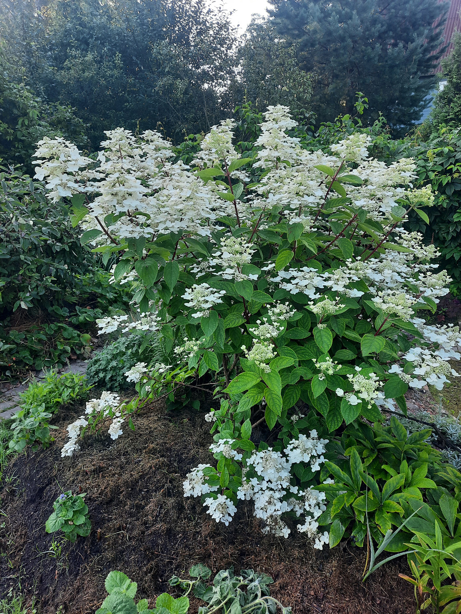 Очень оперативно и очень коротко! Удалось попасть в интернет, чуть-чуть проявился. Но насколько хватит, даже не знаю! С утра сделала несколько коротких заготовок на всякий случай. Это одна из них! Красивая гортензия с фертильными цветками живет и цветет у меня уже несколько лет. Разрослась, красавицей стала! Куст большой, нарядный очень. Посадила я его удачно - имеется круговой обзор! Можно подойти довольно близко и рассмотреть шапки, точнее, метелки, ведь она метельчатая! Я как-то рассказывала, что при покупке в Максидоме выяснить сорт не удалось. Гортензия и гортензия... Даже документы от поставщика посмотрели. Ни - че - го! Муха не справилась с вожделнием поиметь что-то от цветка... С какой стороны не подойдешь, везде смотрится красиво. Пушистый куст получается. Всю мелочь осенью я выломала или вырезала, но все равно густо. Думаю, нынче побольше уберу, чтобы внутри воздух был. Этот вариант любования мне больше других нравится. На зеленом заднике белоснежный солист! С годами кис