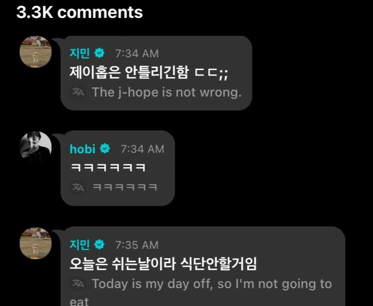 🌺 Хосок и Чимин прокомментировали эфир Джина: Чимин: Джей-Хоуп не ошибается. Хосок: ㅋㅋㅋㅋㅋㅋㅋㅋ Чимин: Сегодня у меня выходной, так что я не буду придерживаться диеты, ㅋㅋㅋㅋㅋㅋㅋㅋㅋㅋㅋㅋ, цирк что ли, ㅋㅋㅋㅋㅋㅋㅋㅋ, уксус, ㅋㅋㅋㅋㅋㅋㅋㅋㅋㅋ Хоби: В последнее время ребята усердно занимаются спортом. Все в спортивном режиме. Чимин: ㅋㅋㅋㅋㅋㅋㅋㅋ Хоби: Когда ты, чёрт возьми, собираешься есть? Хоби: Теперь ешь. Наверное вкусно. Чимин: ㅋㅋㅋㅋㅋㅋㅋ, я тоже скоро буду есть, ㅋㅋㅋㅋㅋ #JHOPE #JIMIN @kumihobts