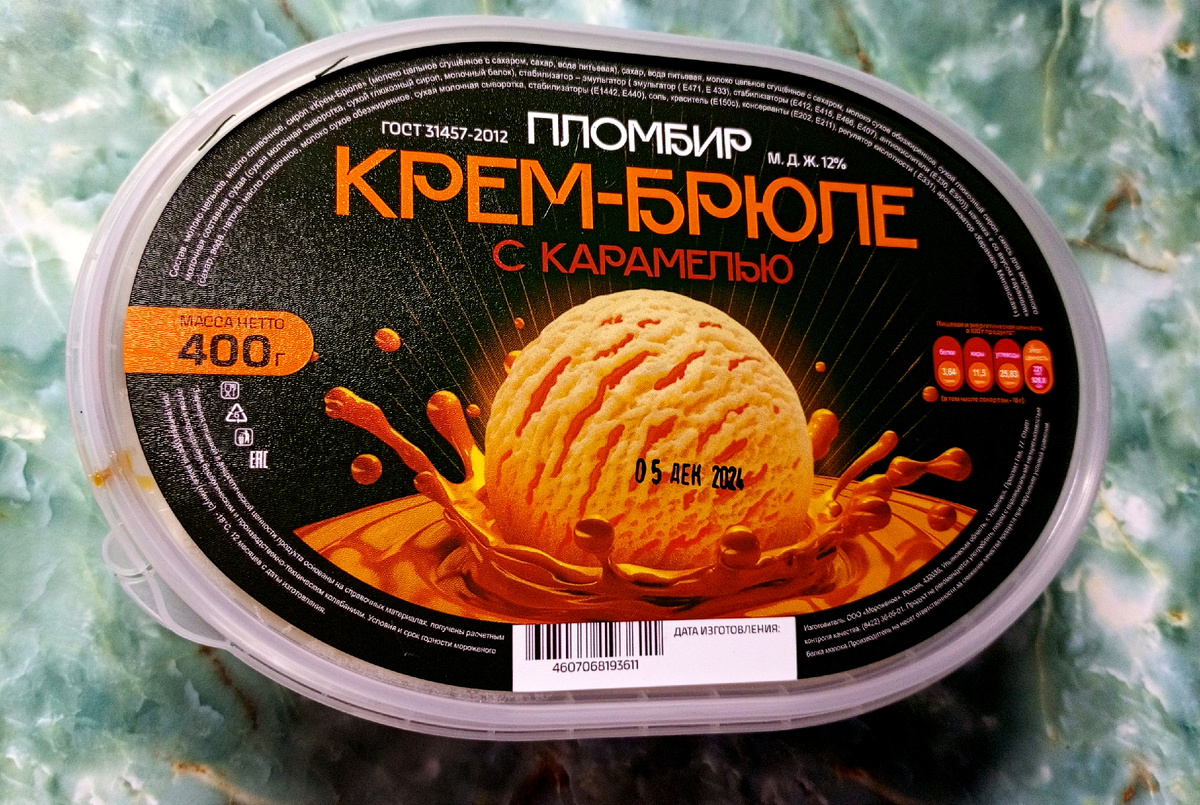 Люблю мороженое необычное. Такое я увидела в магазине "Победа". Решила попробовать. Изготовитель ООО "Мороженое", Ульяновск. Состав: молоко цельное, масло сливочное, сироп "Крем-брюле", сахар, вода питьевая, молоко цельное сгущенное с сахаром, молоко сухое обезжиренное, сухой глюкозный сироп, смесь для мороженого, молочная составная сухая, стабилизатор- змульгатор ... Очень трудно читать состав, это большой минус. Поэтому читать до конца не стала. Масса НЕТТО 400 грамм. М.Д.Ж. 12%. Изготовлено по ГОСТу. Цена 200 рублей. За такое мороженое 200 рублей совсем не дорого. Брала пару раз. Посмотрите,какое оно красивое. И вкусное. А распаковка ниже: Мой канал на Ютубе https://www.youtube.com/channel/UCxR-cVRpbp0ZCwUI4Sro3aA ВСЕ ФОТО АВТОРА ЕЩЕ СТАТЬИ о мороженом из магазина "Победа" НА КАНАЛЕ Мисс Обзоровна: