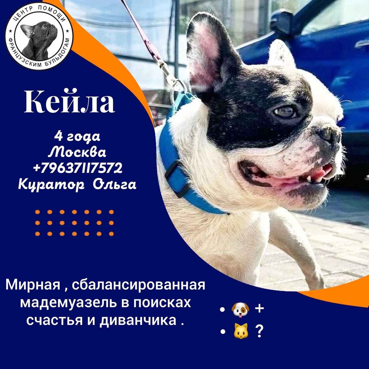 👒 Вот такая вот матрешка по имени Кейла ждёт свою семью . #Кейла@frenchbull_help - молодая , упитанная и веселая булочка . 🌸Она потрясающая: ласковая , дружит со всеми , очень-очень человекоориентирована . Так и льнет к рукам . 🌝Семьи с детьми , и даже с маленькими детьми , берите без страха , это будет отличная подруга и нянька . 🐶Более того , она дружит со всеми собаками подряд . Насчет котиков не знаем . Смотрите её альбом /отчет : https://vk.com/topic-144285450_53156774 🫶🏼и мы с Кейлой ждём предложений после заполнения анкеты https://vk.com/app5619682_-144285450 и разговора с куратором , +79637117572 (Ольга). 🙌Скорее приезжайте в субботу за город , в Обушково , знакомиться с этой очаровашкой , чтобы забрать её домой . Редко , когда я б с таким легким сердцем и без тени сомнения отправила бы эту булочку в дом с детьми .
