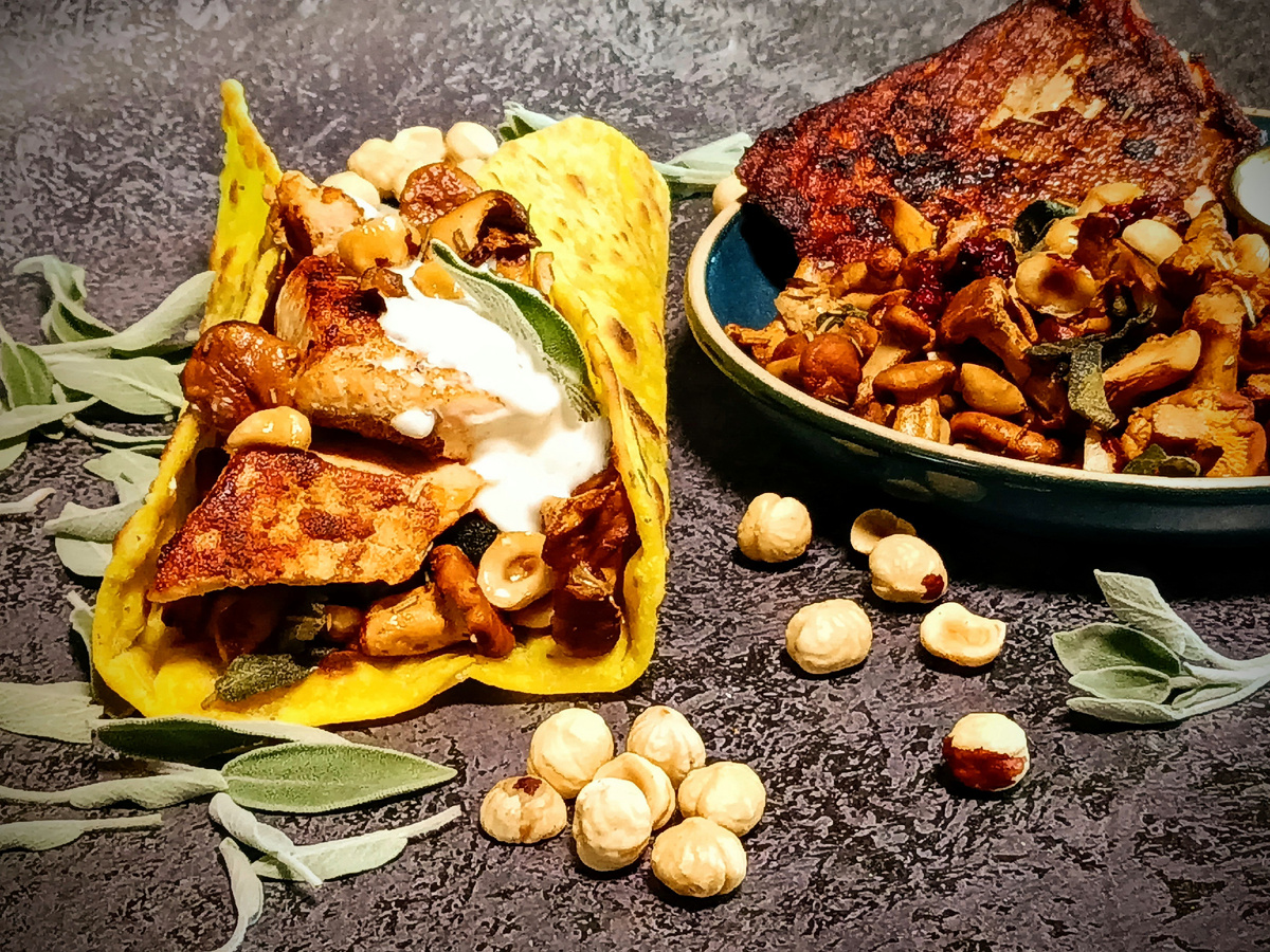 Нежный обугленный лосось, свежие жареные лисички с фундуком и шалфеем и сметанный соус с чесноком. 7 лепешек тортилья