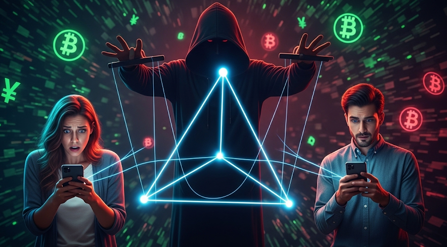 - 🔺 Мошенник (Организатор): Центральное звено. Его цель — получить криптовалюту, не заплатив за нее ни копейки. Он выступает в роли кукловода, который дергает за ниточки двух других участников.