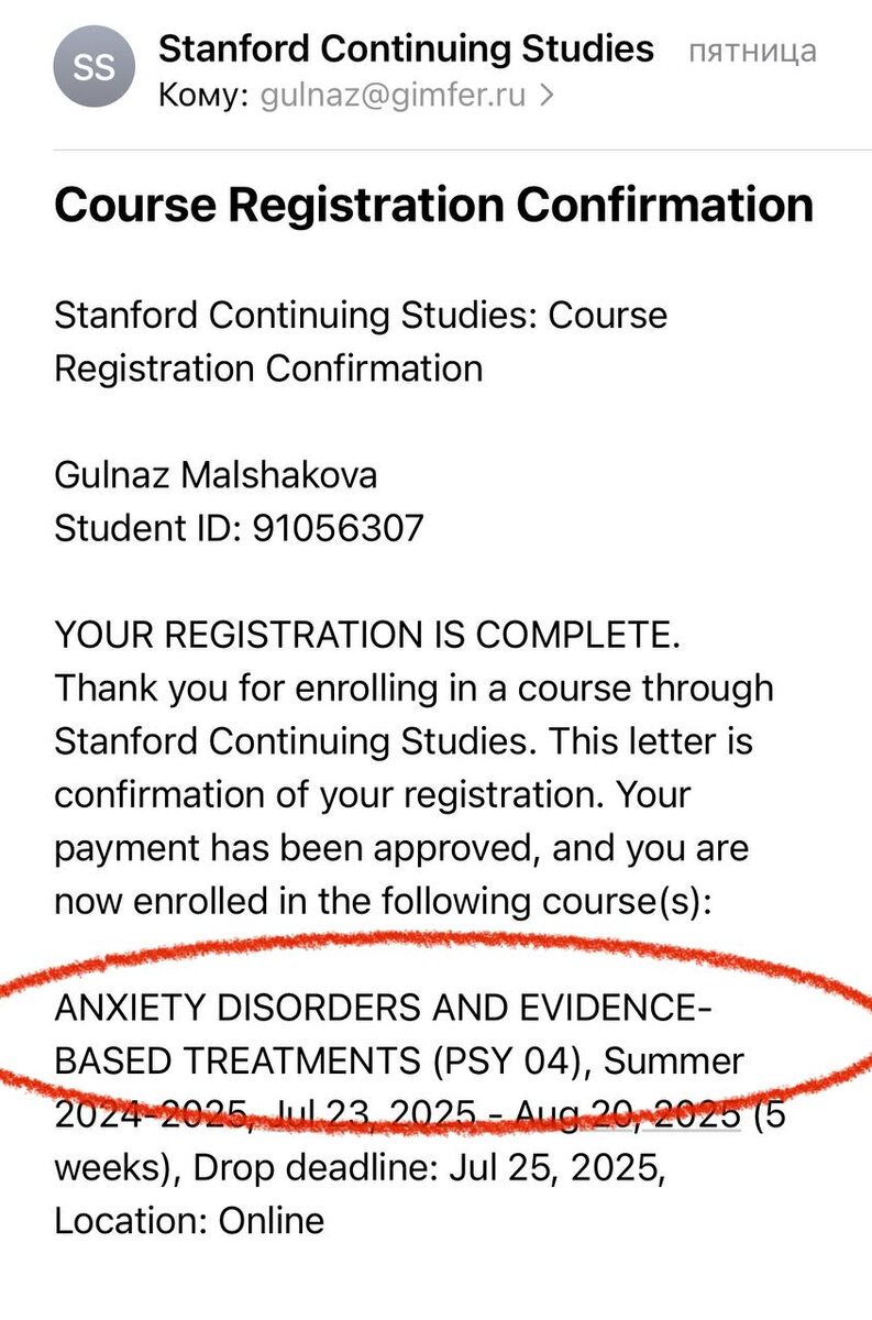 Я даже не знала на какую тему будет обучение в Стэнфорде 🤩 Мне было все равно- лишь бы Стэнфорд! Тема оказалась интересной - тревожные расстройства и методы их лечения! У меня предвкушение ❤️ Вы представляете, я буду учиться у профессоров психологии топ 10 университетов мира 🌍