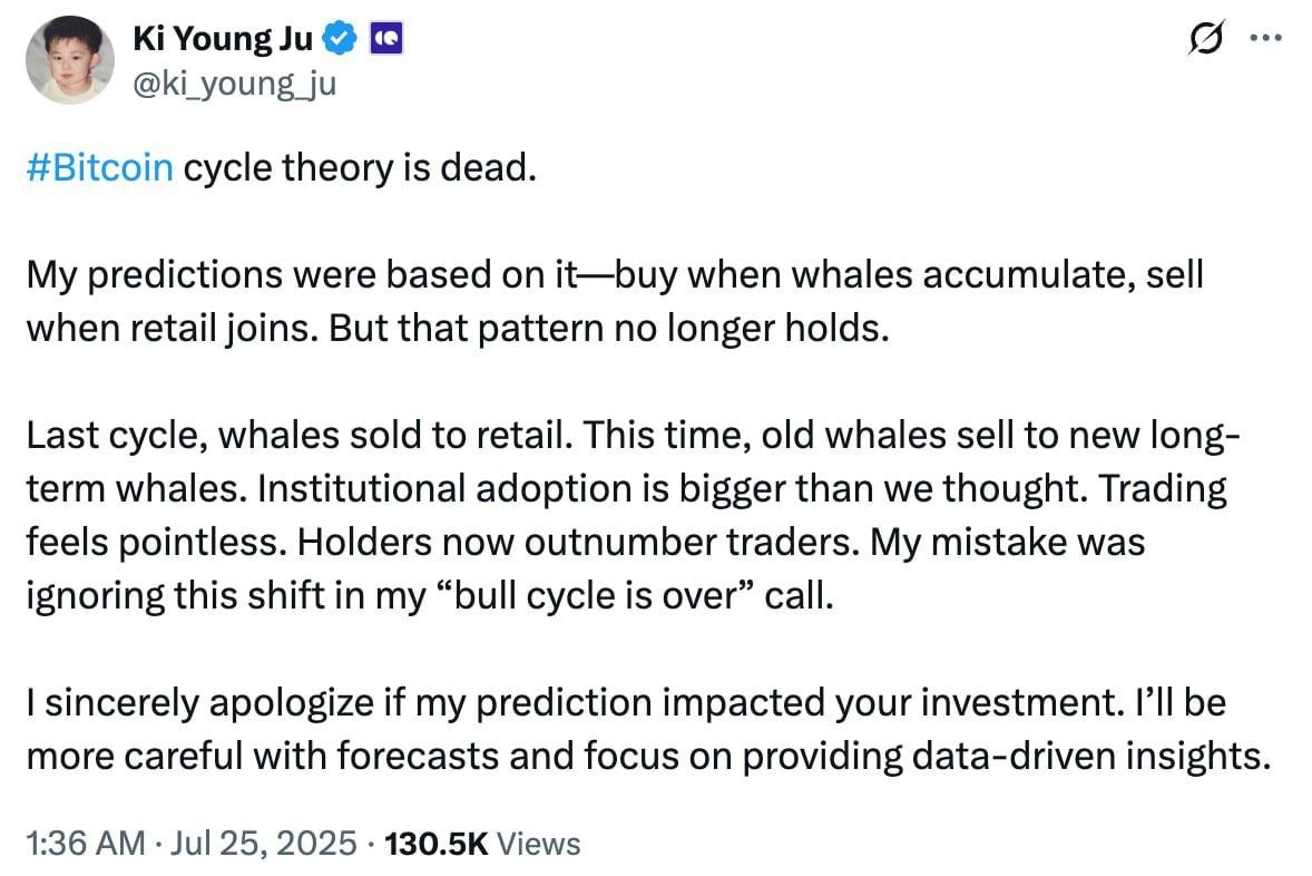 π Π’Π΅ΠΎΡΠΈΡ ΡΠΈΠΊΠ»ΠΎΠ² Π±ΠΈΡΠΊΠΎΠΈΠ½Π° Π±ΠΎΠ»ΡΡΠ΅ Π½Π΅ ΡΠ°Π±ΠΎΡΠ°Π΅Ρ β CryptoQuant CEO CryptoQuant ΠΠΈ Π―Π½Π³ ΠΠΆΡ Π·Π°ΡΠ²ΠΈΠ», ΡΡΠΎ ΠΏΡΠΈΠ²ΡΡΠ½Π°Ρ ΡΡΡΠ°ΡΠ΅Π³ΠΈΡ Β«ΠΏΠΎΠΊΡΠΏΠ°ΠΉ Ρ ΠΊΠΈΡΠ°ΠΌΠΈ, ΠΏΡΠΎΠ΄Π°Π²Π°ΠΉ Π½Π° ΡΠΎΠ·Π½ΠΈΡΠ΅Β» Π±ΠΎΠ»ΡΡΠ΅ Π½Π΅ ΠΏΡΠΈΠ½ΠΎΡΠΈΡ ΠΏΡΠΈΠ±ΡΠ»ΠΈ. π³ Π Π°Π½ΡΡΠ΅ ΠΊΡΡΠΏΠ½ΡΠ΅ Π΄Π΅ΡΠΆΠ°ΡΠ΅Π»ΠΈ ΡΠΈΠΊΡΠΈΡΠΎΠ²Π°Π»ΠΈ ΠΏΡΠΈΠ±ΡΠ»Ρ, ΡΠ»ΠΈΠ²Π°Ρ BTC ΡΠΎΠ·Π½ΠΈΡΠ½ΡΠΌ ΠΈΠ³ΡΠΎΠΊΠ°ΠΌ. Π’Π΅ΠΏΠ΅ΡΡ ΠΆΠ΅ Β«ΡΡΠ°ΡΡΠ΅ ΠΊΠΈΡΡΒ» ΠΏΠ΅ΡΠ΅Π΄Π°ΡΡ Π°ΠΊΡΠΈΠ²Ρ ΠΈΠ½ΡΡΠΈΡΡΡΠΈΠΎΠ½Π°Π»Π°ΠΌ ΠΈ Ρ
