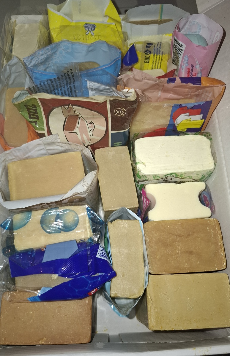 Привет всем) сегодня обзор хозиков Начну с хозов,которые продавались без упаковки,нижний слева лежит года два,не сохнет,всё такой же мягкий,пахнет не вкусно,остальные хорошо просохли и пахнут отлично! Это вид сзади) Эти хозы все очень приятно пахнут,особенно нравится среднее,сочетание хоза с чем то сладким) Верхний брусочек выглядит небольшим,но он тяжёленький, вес 200 гр. нижний тоже 200 гр.,но он шире,средний 150 гр. Верхний хоз Белорусский Linom яблоко,200 гр. лежит года три,вроде подсох, попробую скоро порезать,средний детский хоз,180 гр., нижний тоже Беларусь,125 гр. для детских вещей,у всех слабо ощутимый аромат. Мыло Салют,200 гр.,пахнет сильно, на днях купила тоже Салют,но 250 гр. и упаковка отличается, обязательно покажу потом) среднее хорошо просохло, лёгкий приятный аромат,нижнее маленькое брала в Ашане,обычный хозик без штампиков,пахнет вкусненько. Похожие хозики, сохнут быстро,пахнут приятно,режутся и мылятся хорошо) Тоже похожие хозы,только у нижнего более плотная текстур