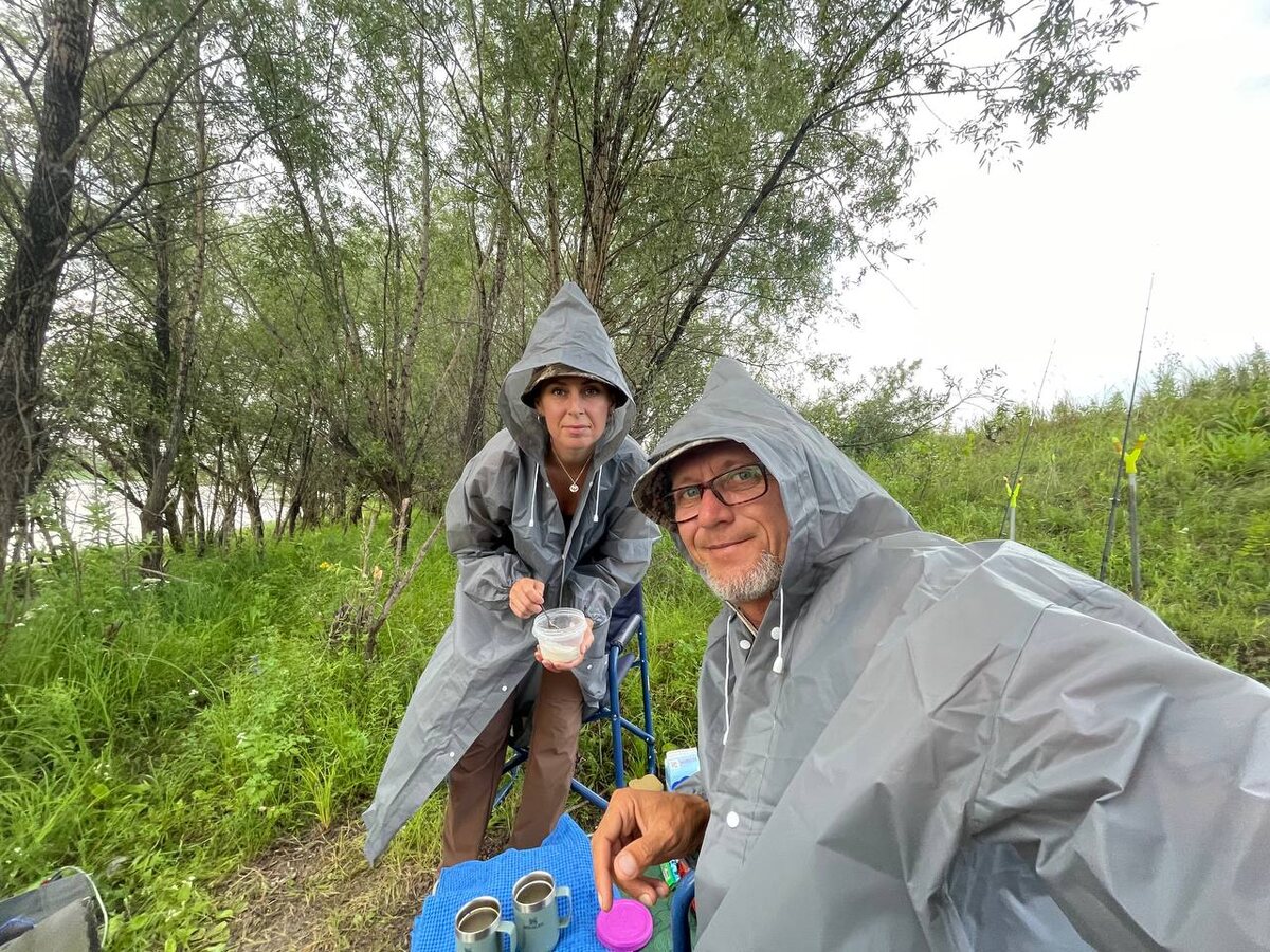 Как всегда, начинаем бодрое утро с проливным дождем. Пора дождей, но если ты опытный лесник или походник, то в твоей коллекции просто обязаны быть дождевики и хорошие термокружки. Почему выбрали дождевики компании KUDADI? Очень высокое качество, непротекаемые. Мы постоянно пробираемся к воде через сухостой, который прокалывал наши прошлые дождевики, и каждый раз нам приходилось покупать новые. Данный дождевик проверен — порвать его очень сложно, плюс он сохраняет тепло, отличная фурнитура, рукава на резинке и наличие капюшона спасают от сильного ливня и ветра. Ну а согревает нас чай в легендарных кружках от компании Stanley. Кружки проверены: шесть часов держат кипяток, охлажденные напитки выдерживают на открытом солнце при температуре +35 градусов Цельсия до трёх часов. Да, дорого, но на практике очень удобно. Ещё раз повторюсь: у нас только оригинальные вещи и устройства, подделки мы не покупаем, и на каждую вещь у нас есть сертификат. Интернет-магазины Ozon и Wildberries мы