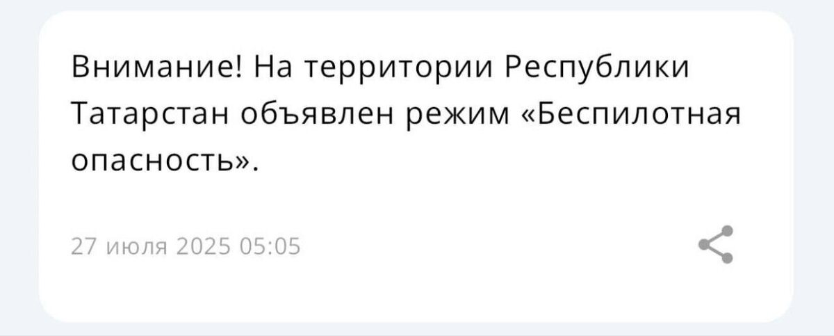 На территории Республики Татарстан с 5:05 действует режим «Беспилотная опасность». 🌟 Tatarstan News