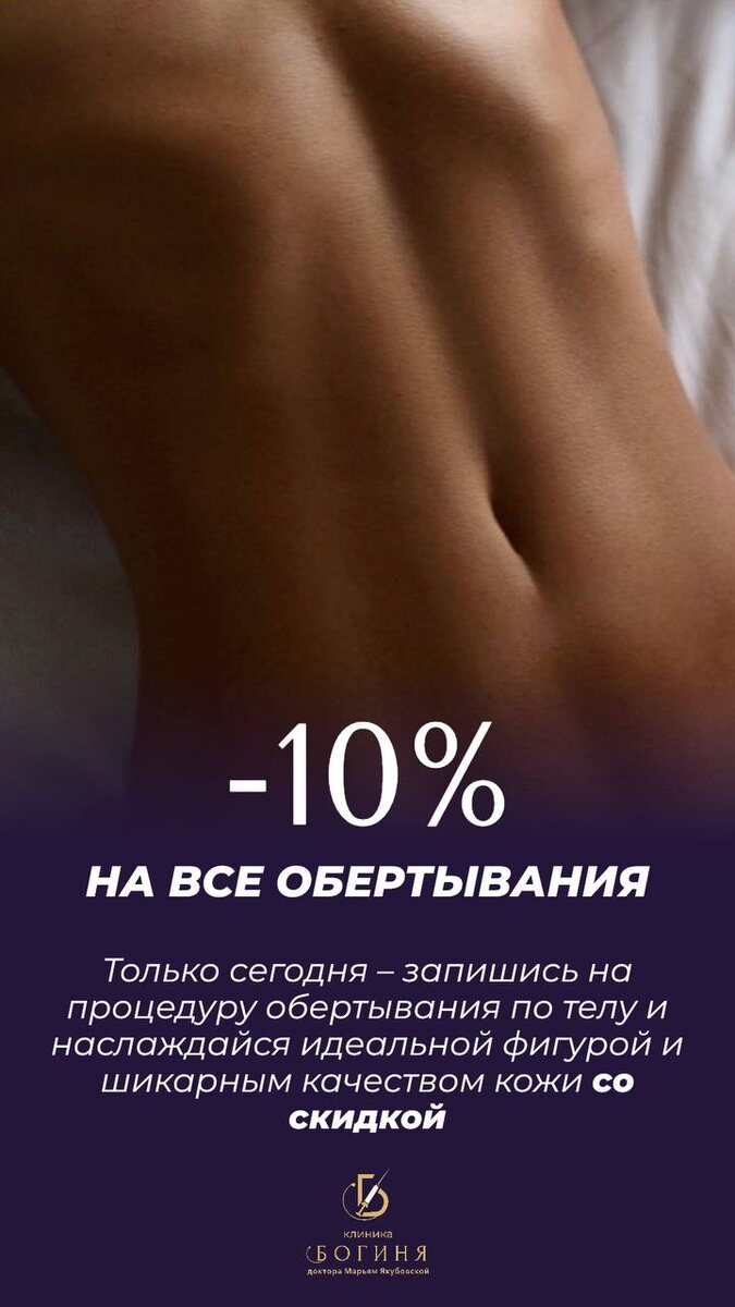 🎉 СКИДКА 10% на любое обертывание Только сегодня! Пора привести тело в идеальную форму! Обертывания: — Убирают отёки и целлюлит — Подтягивают кожу, улучшая её текстуру — Сжигают жир и увлажняют Не упусти шанс! Запишись и почувствуй разницу уже после первого сеанса! 💫