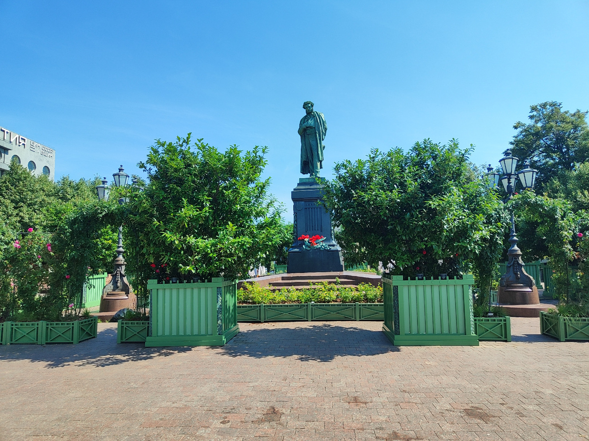 До первой и идти-то не надо, она на Пушкинской площади. Александр Сергеевич оказался в окружении цветущих роз и красивых деревьев.