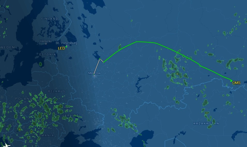 Так выглядит сегодняшний путь авиарейса Омск-Санкт-Петербург - из-за угрозы атаки беспилотников самолет не смог сесть в Пулково.