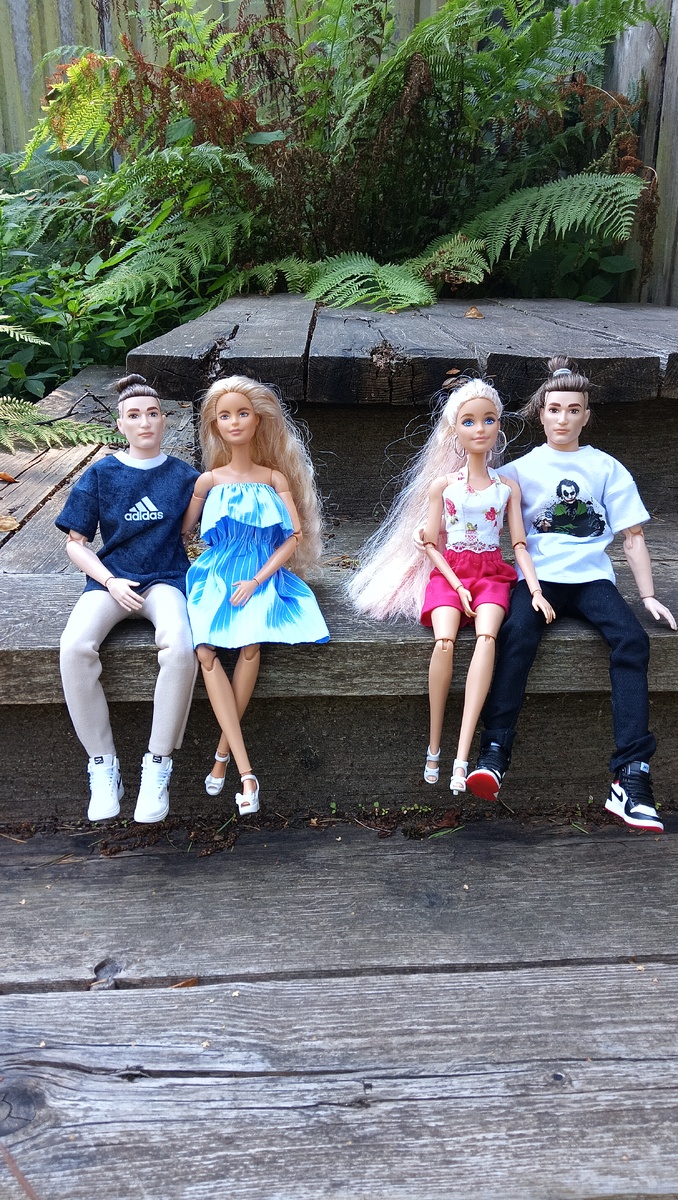 Ездила вчера к отцу за город, прихватила 4 человека с собой 😄Вообще папа сейчас в больнице, мне надо было еду повыкидывать и передачку собрать,. Словила всё ливни вчера 😵💫Сначала жуткая духота стояла, пока кукол фоткала вся вымокла (В итоге до больницы на такси поехала, начался ливень 🤪Потом пока передачу упаковывала всё норм было. Стала уходить, как раз такси заказала, как херануло😩 7 минут под ливнем стояла, гремело так, что я думала, всё, всём чао. Трэш какой-то 🙈 А мне как раз всё по приходило) и куклы и мои шмотки и Алик.... К дому подъезжали, солнце, дождя нет, но гремит. Мистика☹️ Это так, лирическое отступление в форме нытья))) Взяла с собой Милли и Марка, тк у них какие-то проблемы наметились, и Мэл и Макса, новую сложившуюся парочку. Два брата и их подружки 😃 Фоткала по быстрому, очень душно было. Но парочки вели себя хорошо, льнули друг к другу☺проблемы ушли, видимо. Если помните, Макс сначала на свидание с новенькой Санни сходил, но химии не случилось и я пос