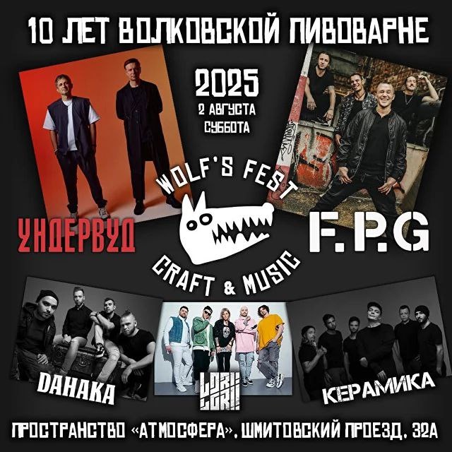 Wolf’s Fest Craft & Music 02.08.2025 12:00 - 22:00 Москва, пространство "Атмосфера" Шмитовский пр., 32А, стр. 1 #Фестиваль в формате open-air посвященный 10-летию «Волковской Пивоварни». ВАС ЖДУТ: 60 СОРТОВ ВОЛКОВСКОЙ ПИВОВАРНИ ОТ ЛИМИТИРОВАННЫХ ДО ЛЕГЕНДАРНЫХ всего 250руб. ФЕСТИВАЛЬНОЕ ПИВО БЕСПЛАТНО И БЕЗЛИМИТНО ВЫСТУПЛЕНИЯ ГРУПП: УНДЕРВУД F.P.G. DAHAKA КЕРАМИКА LORI LORI а также УЛИЧНЫЙ СТРИТ-ФУД ПИВНОЕ КАЗИНО БИР-ПОНГ ГАСТРОМАРКЕТ ДЕЛИКАТЕСОВ МАРКЕТ АВТОРСКОЙ ОДЕЖДЫ И АКСЕССУАРОВ ФИРМЕННЫЙ МЕРЧ ОБОРУДОВАННАЯ БАСКЕТБОЛЬНАЯ ПЛОЩАДКА И СКЕЙТ-ПАРК ...и вся волчья душа на кранах и сцене. Будет громко, вкусно, весело, как и положено на дне рождения тех, кто вместе с вами превратили любовь к крафтовым экспериментам в масштабное движение. 🐺 Домашнее пиво