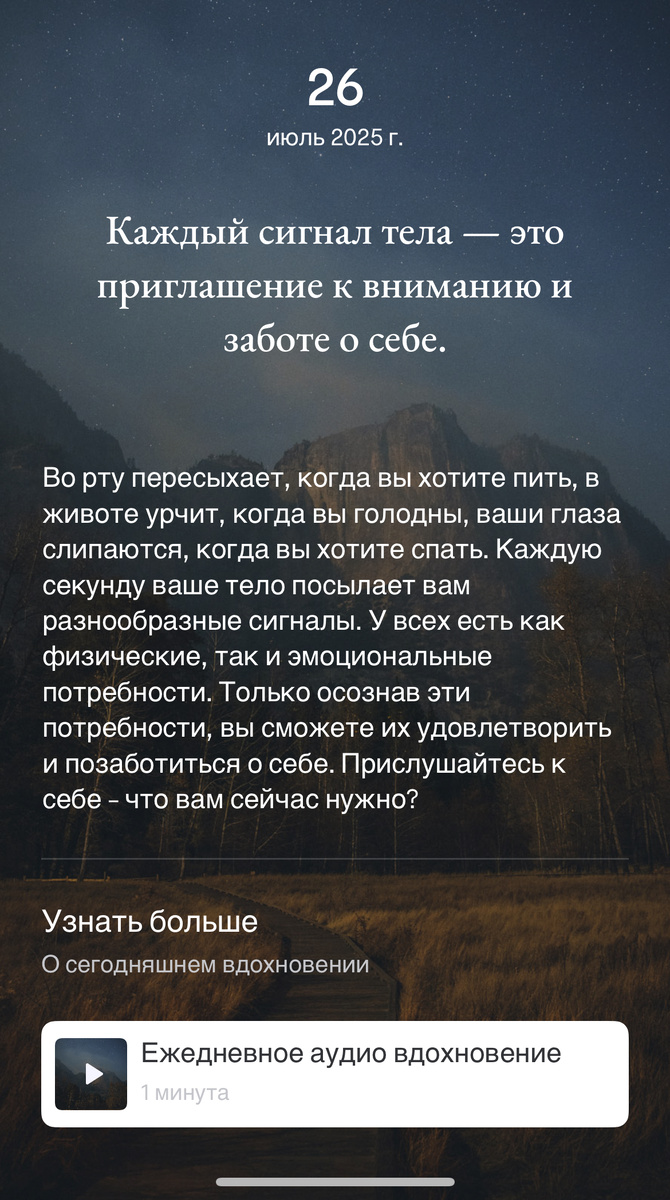 Утро. Дача. 6.30. Проснулась без будильника — будто внутренний маятник сработал точно по расписанию. Самочувствие, правда, подвело. Женщины поймут — день, когда организм просто просит тишины и заботы. Поясница ноет, голова звенит, как старая колокольня перед грозой. Выпила воду, таблетку — и обратно под одеяло. На улице солнце вовсю протирает глаза, расправляя облака как утренние простыни. А у меня единственная цель на ближайший час — восстановиться. Даже приложение в телефоне об этом напомнило. Каждый день с утра мне присылает ежедневное вдохновение. И всегда в точку. Второе пробуждение — 8:30. Уже полегче. Солнце щекочет занавески, воздух свежий, в окна доносится пение птиц, как будто весь мир сегодня немного подождал, пока я приду в норму. Выхожу на улицу босиком. Хочется почувствовать траву под ногами, как в детстве. Расстелила коврик прямо на земле — займусь йогой на траве. Солнце ласково греет спину, ветер играет прядями волос — утро наконец вступило в свои права. Планы на день б