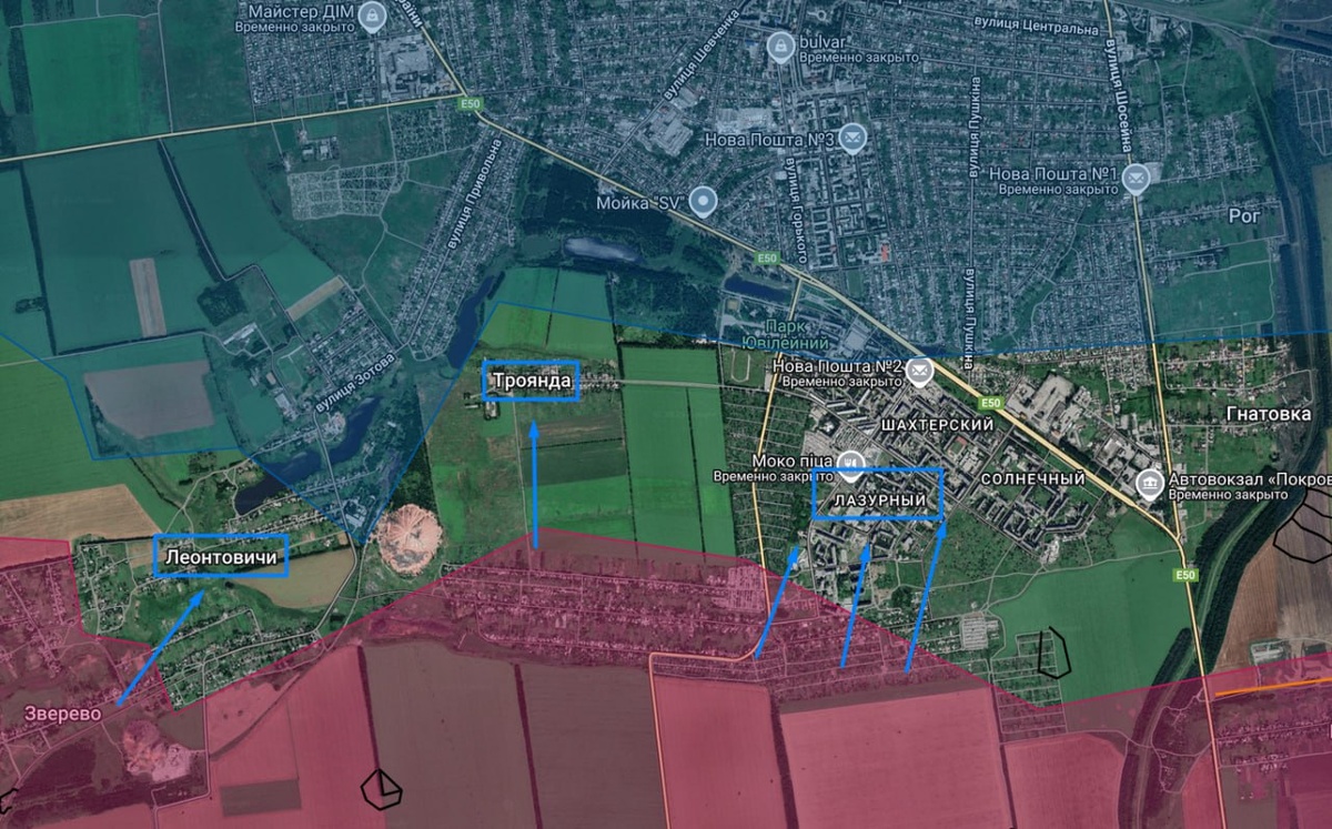 Есть мутные слухи, что ВС РФ занимают позиции едва ли не в центре Покровска, но они ничем не подтверждаются. По более достоверной информации передовые позиции ВС РФ есть в районе Лазурный. Посёлки Леонтовичи и Троянда в «серой зоне».
