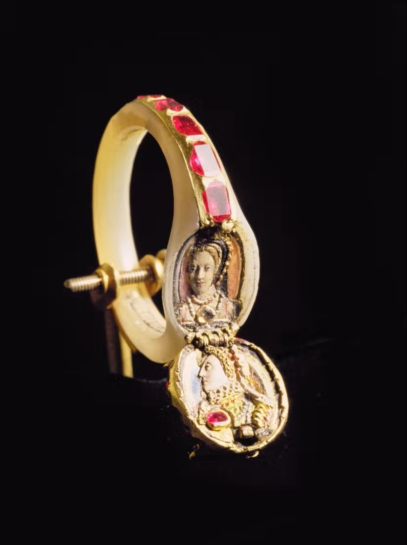 Кольцо датируется приблизительно 1575 годом. Оно выполнено из перламутра, передняя часть покрыта золотом и украшена плоскогранными рубинами и бриллиантами, жемчугом, а также декорировано эмалью.Оно содержит сразу два портрета: самой королевы Елизаветы и ее матери, Анны Болейн. Прекрасное золотое кольцо с бриллиантами, рубинами и перламутром было снято с руки королевы в 1603 г. На протяжении ее долгого царствования кольцо было мучительным напоминанием о трагедии, порожденной политическими интригами. Кольцо королевы таило секрет. Ячейка внутри кольца хранила портрет ее матери Анны Болейн, потерявшей любовь короля и собственную голову, когда Елизавете было два года. Позднее, взойдя на престол, ее брат Эдвард объявит девочку незаконнорожденной, а сестра Мэри, также став во главу государства, отправит ее в тюрьму и приговорит к смертной казни. Согласно легенде, Роберт Кэри снял кольцо с пальца Елизаветы, когда она скончалась. Кэри скакал не останавливаясь и достиг границы с Шотландией за