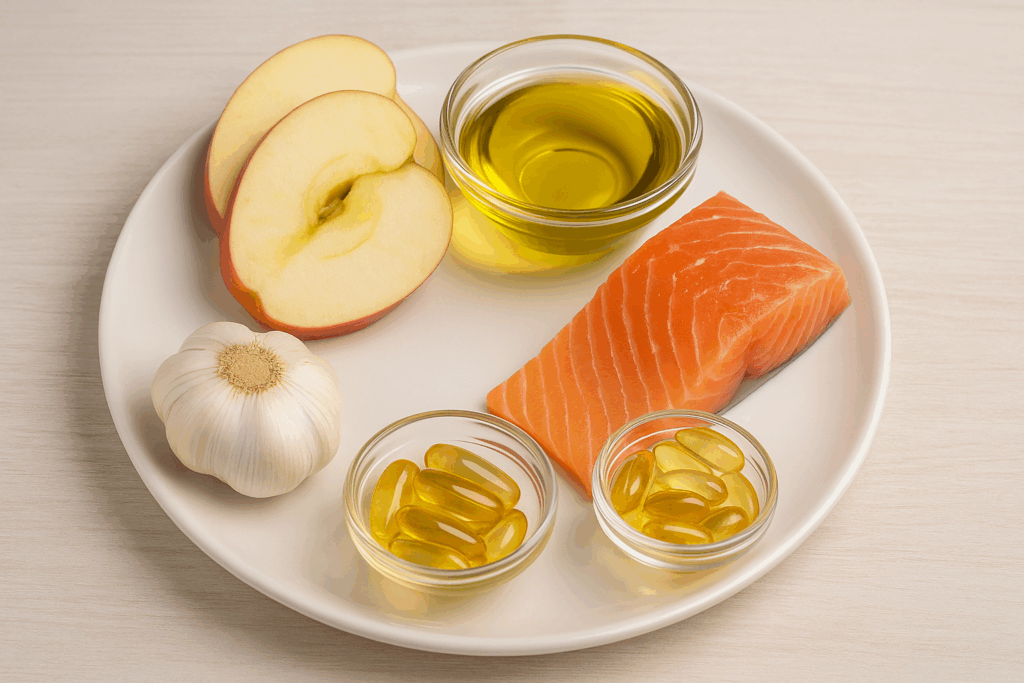 Атеросклероз — опасное заболевание сосудов, при котором в артериях накапливается холестерин. Со временем образуются бляшки, которые сужают просвет сосудов и мешают нормальному кровообращению. Но есть хорошие новости: с помощью правильного питания можно существенно замедлить развитие болезни. Вот пять продуктов, которые стоит включить в рацион — они работают как «естественные защитники» ваших сосудов. 🧄 1. Чеснок Чеснок помогает снизить уровень «плохого» холестерина, расширяет кровеносные сосуды и улучшает циркуляцию крови. Он способен уменьшать размеры уже сформировавшихся бляшек и предотвращает образование тромбов. 🫒 2. Оливковое масло В нём много мононенасыщенных жирных кислот, которые благотворно влияют на обмен веществ и снижают вредный холестерин. Кроме того, оливковое масло содержит антиоксиданты, защищающие клетки от повреждений и преждевременного старения. 🐟 3. Рыбий жир Источник ценных омега-3 кислот, которые положительно влияют на сердце и сосуды. Рыбий жир помогает снизит