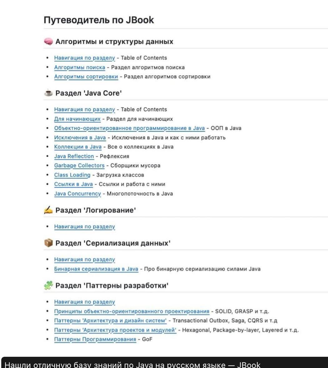 🖥 ОГРОМНАЯ обучающая база по Java на русском языке — настоящая золотая жила для тех, кто хочет освоить один из самых востребованных языков в IT. Это не просто курс — это полноценный путь от абсолютного нуля до уровня, пригодного для поиска работы. Вы пройдёте всё: от основ языка и ООП до современных фреймворков, паттернов проектирования и реальных практик разработки. 🔹 Что внутри: 🟡 Полный путь обучения языку: синтаксис, концепции, архитектура, best practices 🟡 Ключевые алгоритмы и паттерны решения задач — с примерами и объяснениями 🟡 Множество видеоразборов сложных тем и реальных кейсов 🟡 Практика на каждом шагу: упражнения разного уровня сложности после каждой лекции 🟡 Проект живёт с 2018 года и постоянно обновляется — вместе с новыми версиями Java, Spring, инструментами и подходами Здесь вы не просто выучите Java — вы станете настоящим базированным разработчиком. 🚀 Становимся гуру Java здесь @javarush