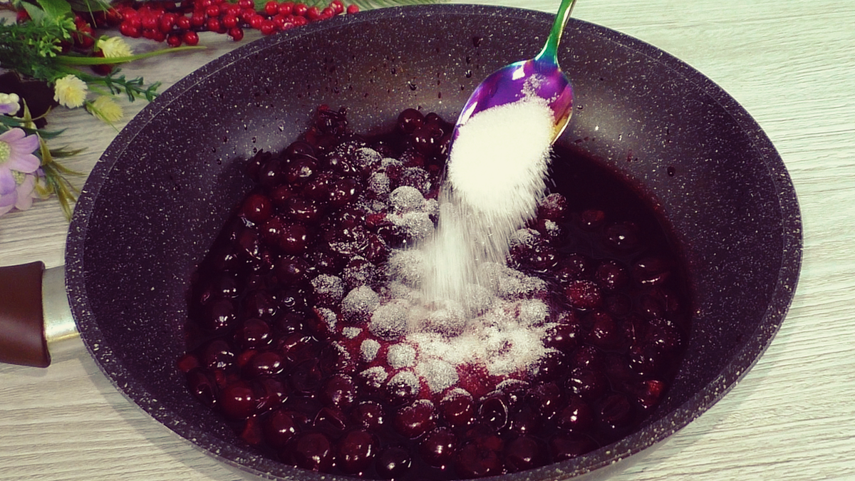 Всыпаем сахар в вишню без косточек, по вкусу, ставим на плиту и доводим до кипения.