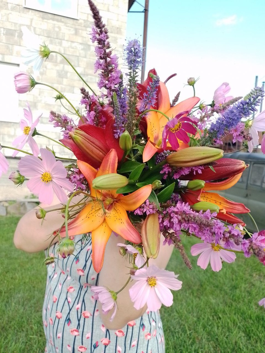 Вчера у сестры был юбилей, дарила ей вот такой букет, сделанный из цветов с моего участка. В букете использовала лилии, космею, дербенник м веронику.