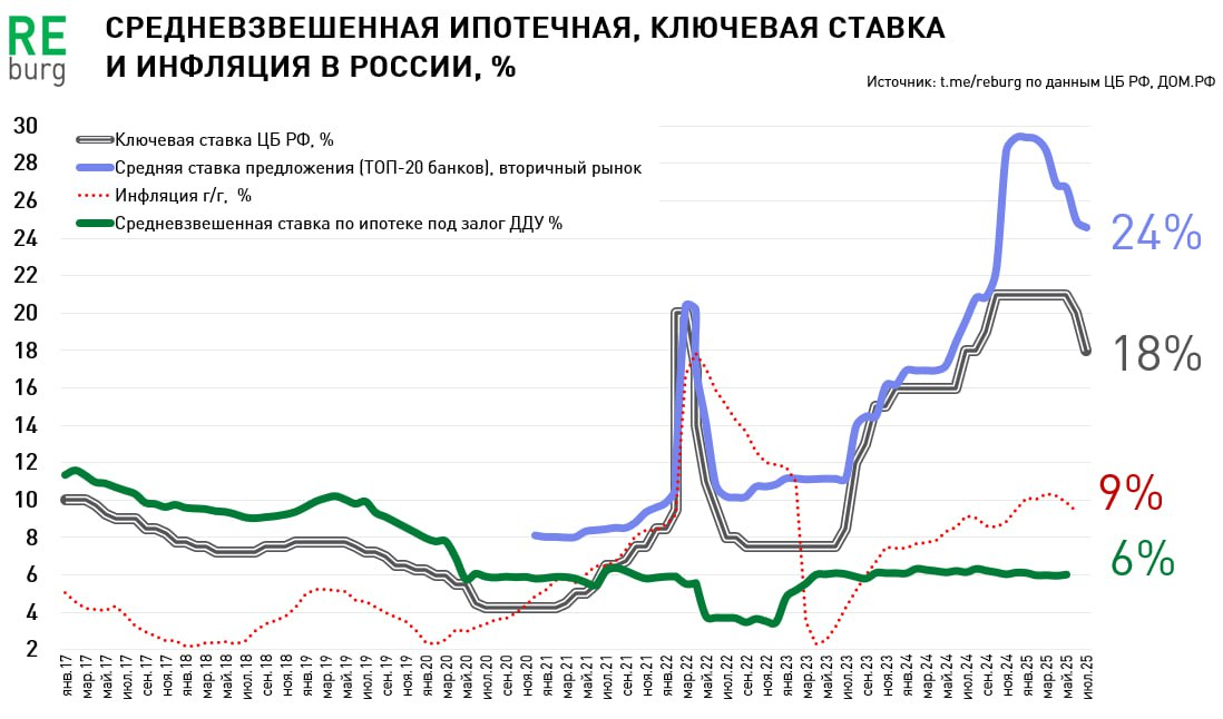 ◾️Рабочие рыночные ставки по ипотеке, которые позволят вовлекать в рынок массового покупателя, будут не ранее 2026 года. Быстрых темпов снижения в 2025 никто не обещает. А в следующем году стоит ждать серьезного обострения конкуренции между "первичкой" и "вторичкой".