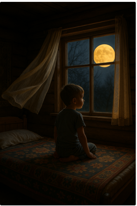 Васятка тоже отпускает мамку на танцы, а сам не спит, лежит на кровати, в окошко смотрит, а там луна большая така, жёлтая, смотрит в окно -то...