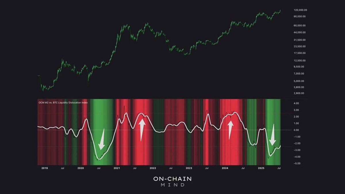 Биткоин отстаёт от ликвидности. И это не фантазия, а расчёт. На графике — индекс дислокации ликвидности от On-Chain Mind. Он показывает, насколько цена BTC опережает или отстаёт от глобального уровня M2 (денежная масса). Зелёная зона — это когда биткоин недооценён по сравнению с ростом ликвидности. Красная — наоборот, когда перегрет. Сейчас мы всё ещё глубоко в зелёной зоне. И вот что интересно: каждый раз, когда BTC оказывался здесь — он быстро догонял. Как пружина, которую сжали слишком сильно. Что это меняет? Это не просто технический сигнал — это подтверждение того, что рынок недооценивает влияние новой ликвидности (в том числе через ETF, корпорации, STRC и т.д.). BTC просто не успевает за фиатным печатным станком. Пока. На что обратить внимание: — Индикатор уже начал разворачиваться — Похожий паттерн был в марте 2020, июле 2021 и ноябре 2022 — После разворота каждый раз шёл взрывной рост Ключевая мысль: рынок может “казаться вялым”, но в фундаменте уже давно горит фитиль.