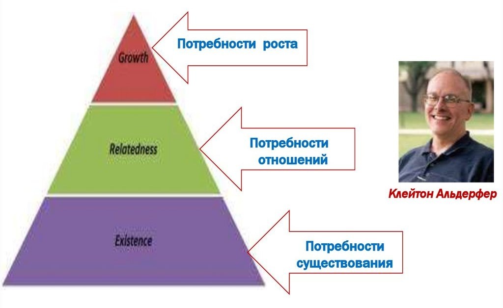 Если послушать доклады студентов-педагогов и психологов на научных конференциях, там довольно часто упоминается ПИРАМИДА МАСЛОУ. Что, в общем-то, вполне закономерно, учитывая её красоту и простоту. Но если бы я снова стал студентом, то непременно выпендрился-бы по-научному, сказав, что мне, мол, ближе и интереснее ПИРАМИДА АЛЬДЕРФЕРА, поскольку она... И далее краткое содержание ТЕОРИИ АЛЬДЕРФЕРА (или теории ERG). Она касается структуры потребностей в связи с мотивацией человека к деятельности. Сам Клейтон Альдерфер, психолог Йельского университета, не отрицал работ Маслоу, но считал, что существует только три потребности, которые заботят людей: При этом, по мнению Альдерфера, следует обязательно учитывать возрастные особенности мировоззрения человека. Потому как в 14 лет он стремится к одному, 28 его это уже мало волнует, и важно другое, а в 48 - вообще третье. По мнению психолога, существует чёткая связь между удовлетворением потребностей и их активизацией, в результате чего можно