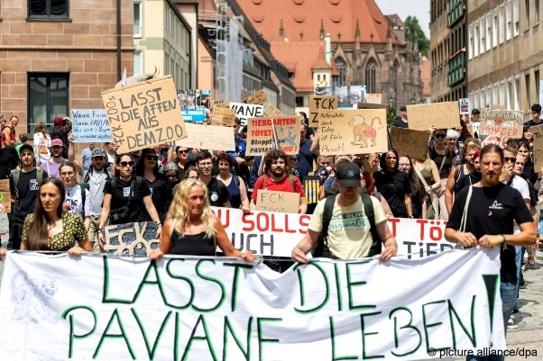 В немецком Нюрнберге прошла акция зоозащитников, которые выступили против решения администрации местного зоопарка об убийстве нескольких гвинейских павианов из-за того, что "стадо слишком разрослась", - сообщает Deutsche Welle. Более того, администрация зоопарка публично заявила о планах усыпить часть приматов, численность которых увеличилась до 45 особей, тогда как вольер рассчитан лишь на 25 животных. Представители зоопарка утверждают, что "из-за перенаселения, в вольерах ухудшилась социальная структура группы, участились конфликты и травмы среди павианов". При этом чиновники не исключили, что туши умерщвленных животных скормят хищникам, обитающим в этом же зоопарке. Как тут не вспомнить датский зоопарк, который по тем же причинам убил жирафа Мариуса и на глазах у детей разделал его тушу, а затем скормил львам. "Если мы серьёзно относимся к разведению животных, в том числе к участию в программах по разведению, то мы должны следовать тому, что считаем правильным. И это правильно", -