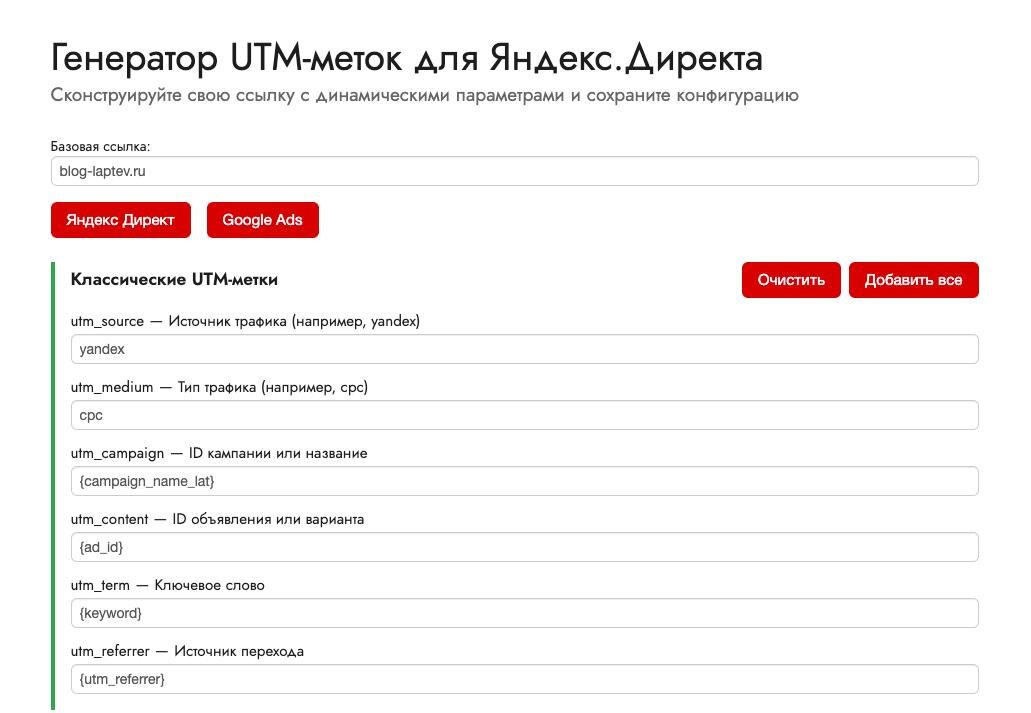 Есть режим с базовой ссылкой и просто хвостом, описание каждого параметра, понятный интерфейс и кнопка "добавить все" в каждом блоке.