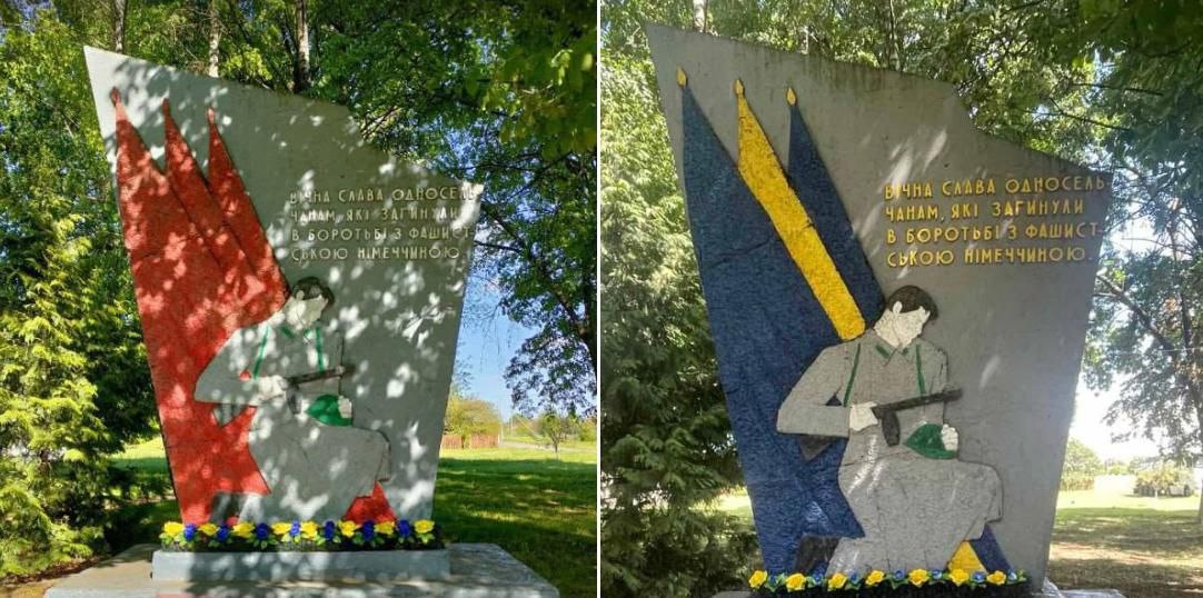 В селе Привольное Ровенской области жители вместо того, чтобы снести памятник своим дедам, перекрасили его в жёлто-голубые цвета в надежде