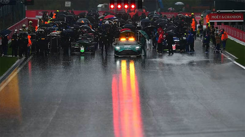 После сухих выходных в Спа в воскресенье наконец-то разверзлась облачность, заставив гонщиков впервые перейти на дождевые шины. Машина безопасности лидировала на прогревочном круге, пока гонщики осторожно маневрировали в сложных условиях.