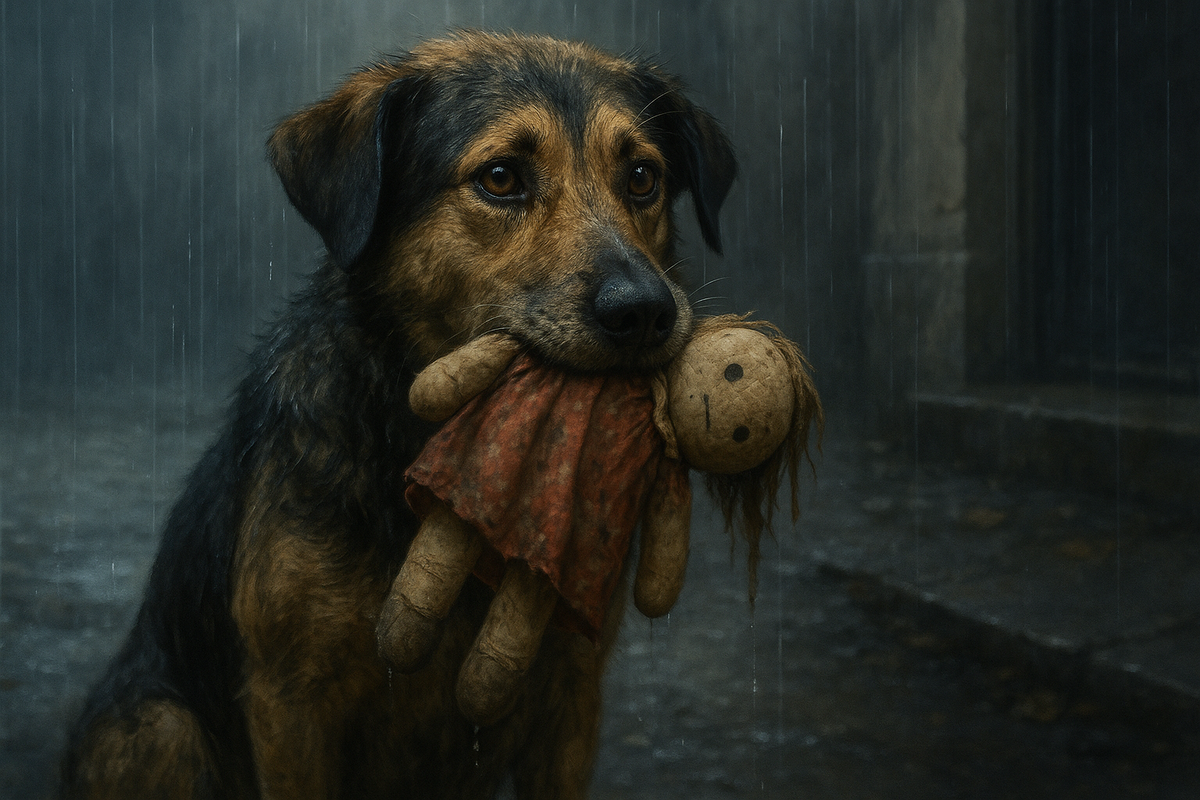 И тряпичная кукла в зубах. Потемневшая, грязная, с едва различимой вышивкой. Та самая. Не игрушка — символ. Связь. Память.