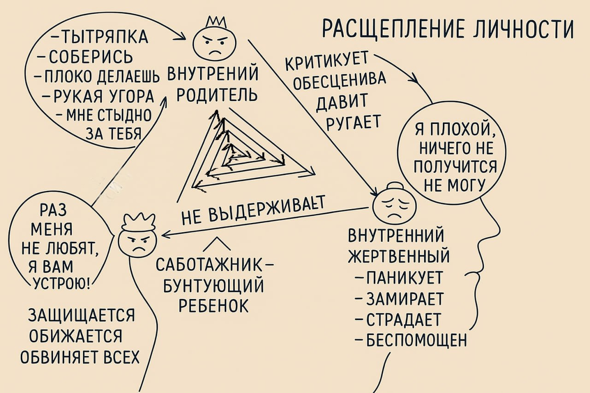 Решила для наглядности сгенерировать картинку с помощью ИИ. И это я еще не все нарисовала😂. Вот, что происходит в голове псевдовзрослого человека😜. Это бесконечный внутренний конфликт разных частей личности. Человек не может договориться внутри себя. Внутри него живет несколько неавтономных эго-состояний, сцепленных друг с другом. Так Саботажник связан с отвергающим Родителем. Плохой Родитель связан с Ребенком. Человек ведет непрерывный, цикличный, внутренний диалог между ними. Человек принимает этот диалог за размышления взрослого человека. А на самом деле в нем говорит сначала Критикующий Родитель👉🙅, оправдывается несчастный Ребенок🙇♂️, а потом негодует Саботажник🧛♀️. Здесь бунт ради бунта. Страдания ради страдания. Безвыходность. Главное - это неконструктивный внутренний диалог. Он создает иллюзию "решения" через вину, стыд и контроль со знаком минус. Он никогда не приведет к пониманию ситуации и не заставит человека действовать и меняться. Здесь метанойя (покаяние) не про