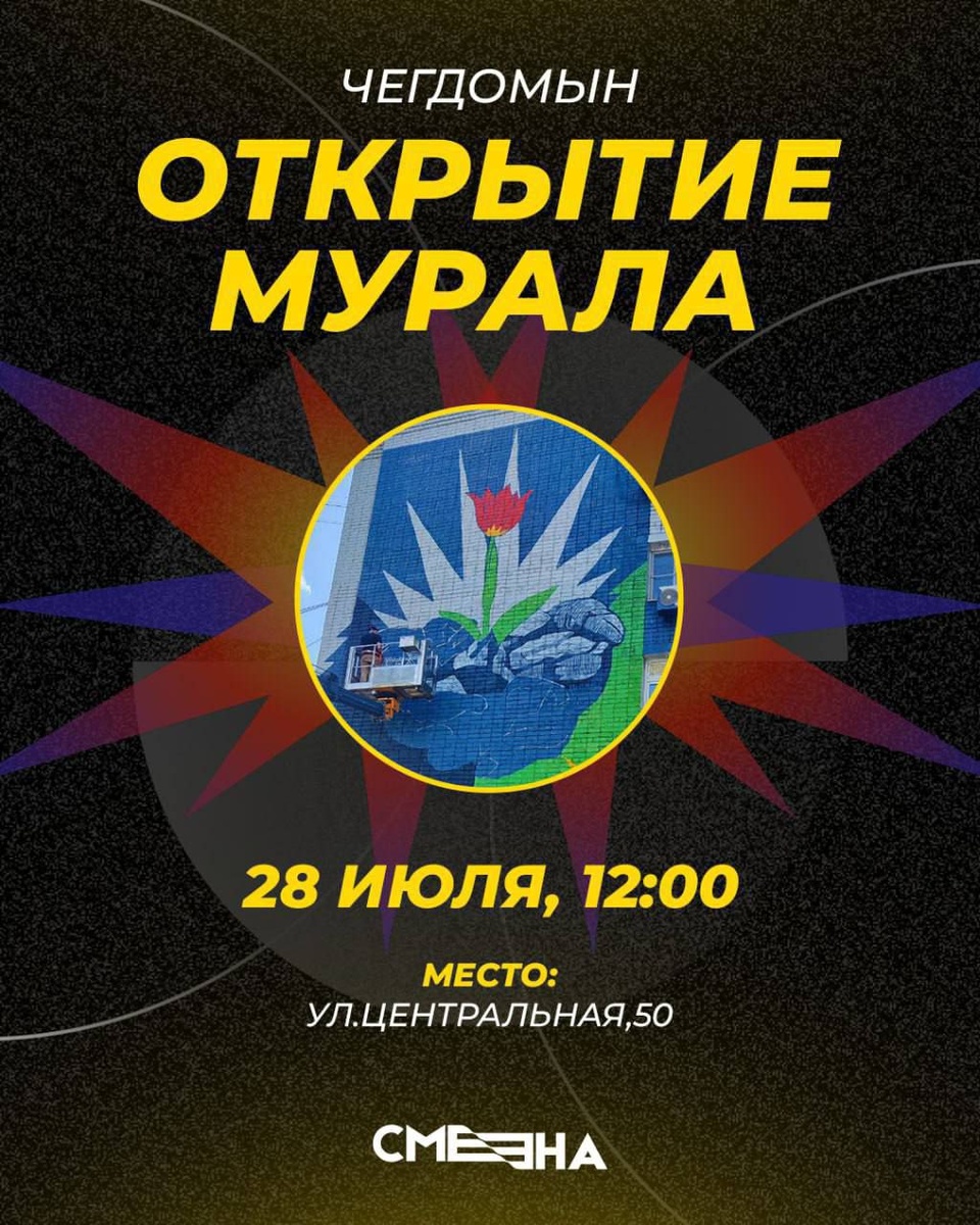В рамках паблик-арт фестиваля «СМЕНА» на фасаде дома по улице Центральная завершается создание большой росписи, за которой стоит большая совместная работа. Художник Мансур Зияев, Фонд Мельниченко, СУЭК и сам поселок — все поучаствовали в том, чтобы в Чегдомыне появилась новая точка притяжения.
