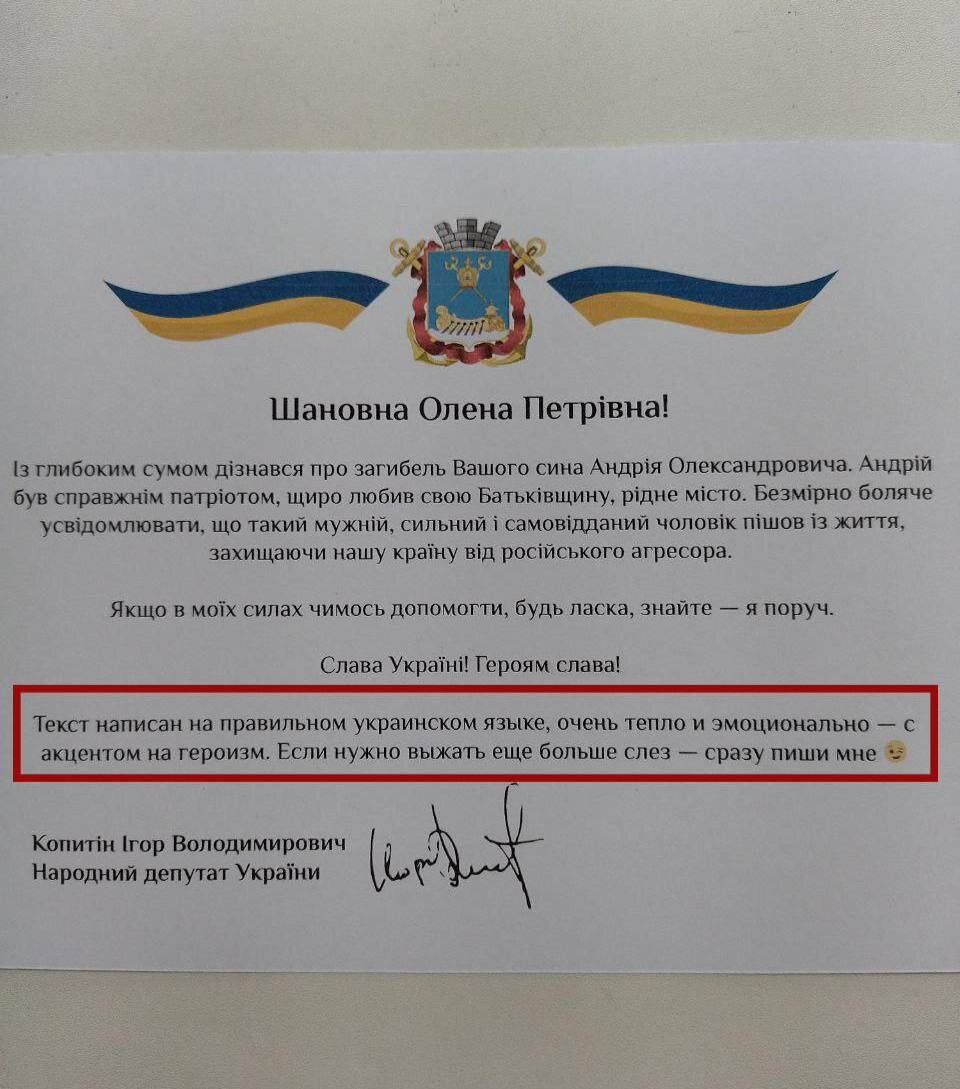 Если нужно выжать больше слез - сразу пиши мне. Такое замечательное письмо направил депутат Рады от партии Враг народа Игорь Копытин матери погибшего ВСУшника. В украинских каналах настаивают, что текс письма депутат готовил с помощью ИИ. А я думаю, что Копытин таким оригинальным способом предлагал женщине отправить на мясо ещё одного сына или мужа. Тогда слез действительно станет больше. Обратите внимание, самое важное депутат написал по-русски, чтобы мать погибшего точно поняла. Подпишись на Телеграм Александр Семченко