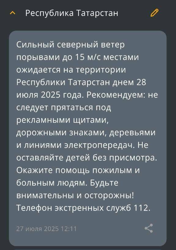 В Татарстане 28 июля ожидается сильный ветер порывами до 15 метров в секунду. МЧС напоминает татарстанцам, что на улице следует держаться подальше от рекламных щитов, вывесок, дорожных знаков, линий электропередач. Все окна домов нужно плотно закрыть, убрать с балконов и лоджий предметы, которые могут выпасть наружу. Необходимо держаться как можно дальше от окон в жилом или рабочем помещении.