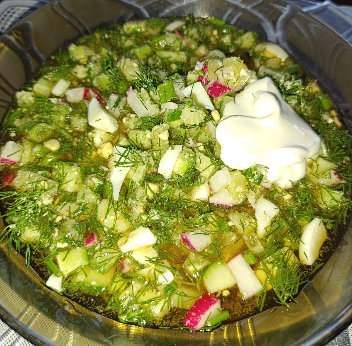 Прекрасное блюдо для жары 🥵🥵🥵. И каждый готовит ее по своему. Кто-то любит на квасе, кто-то на кефире, а кто-то заправляет таном.😎 Кто-то любит крупную нарезку, кто-то мелкую. 😎 А кто-то ее вообще не любит (да-да, как-то я писала, что в моей семье вкусы у всех разные. Так вот, один член моей семьи ее вообще не ест, а другой - только в весенне-летний период🤯). Предпочтения у всех разные. Скажу больше: даже одна хозяйка ее может готовить по разному. Сегодня у меня из состава: редис, свежие огурчики, яйца, укроп и зеленый лук. Заправила квасом и сметаной. Дело в том, что я окрошку очень люблю и готовлю ее летом, весной, осенью и даже зимой. Заправляю всегда квасом. Пробовала и кефиром заправлять, и таном. Кушать можно, но не мое. Тут дело вкуса (излишняя кислинка от кефира и тана - не мой вкус 😉). А вот состав, я заметила, что меняется у меня в зависимости от времени года. Летом это облегченный состав, как сегодня. Весной и осенью сметана заменяется на майонез, а зеленого лука д