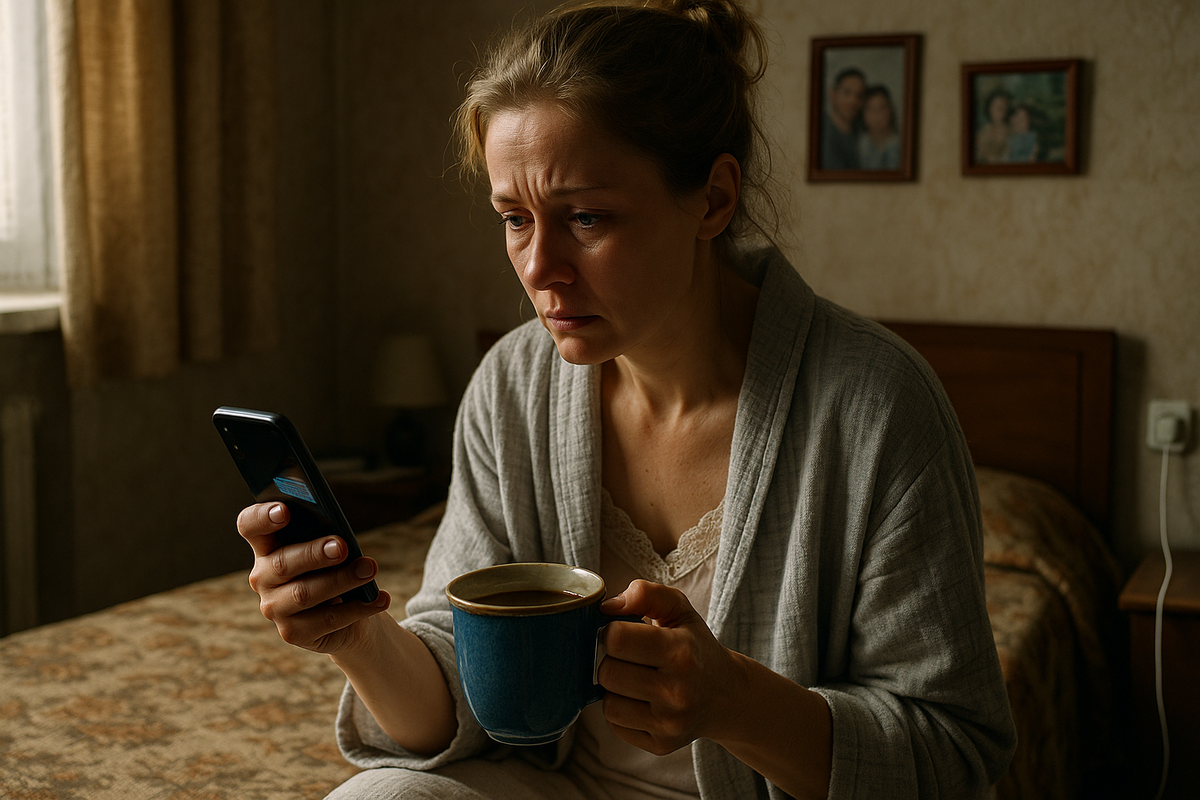 История Марины началась с забытого телефона. Обычное субботнее утро, Павлик уехал с друзьями к речке ещё затемно, дома тишина и покой. Марина налила себе кофе в любимую чашку — ту самую, синюю с золотой каёмочкой, которую муж подарил на годовщину. И тут взгляд упал на стол. Лежит его старый мобильник.