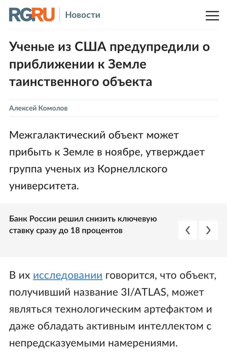 ОНИ СУЩЕСТВУЮТ?!? Незванный гость хуже ....- дальше вы помните, конечно. Особенно, если это касается прибытия инопланетян. Об их возможном посещении Земли заявила группа известных американских астрофизиков. Предполагаемая дата - ноябрь этого года. Как утверждают эти ученые, к нашей планете движется аномальный межзвёздный объект длиной около 24 километров — он превышает по размеру весь Манхэттен. Астрофизики не исключают, что объект может иметь искусственное происхождение. «Если гипотеза окажется верной, последствия могут оказаться катастрофическими для человечества», — написали исследователи. https://vk.com/public212083585 https://dzen.ru/id/660af8bc3bd95d5b99e56429 Подпишись на СВОй "Рассвет"