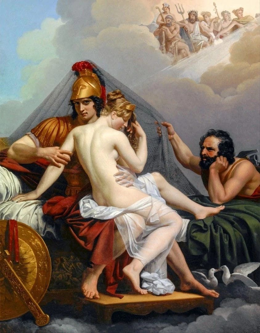 Бог огня, кузнец Гефест, был единственным некрасивым пареньком на Олимпе. К тому же он хромал на обе ноги, чем изрядно веселил обитателей горы. Причем хромота его, судя по всему, этими самыми обитателями и была вызвана, дабы не сбежал ценный ресурс на вольные хлеба. Удивительно, но в жены себе он выхватил аж Афродиту - богиню любви, красоты и слабого передка (судя по биографии). Статус замужней дамы её не смущал, дарила свою любовь Афродита направо и налево. Всегда занятый непосильным трудом, Гефест мало бывал дома, и Афродита в его отсутствие занималась безудержным сексом с Аресом, отвечавшим в Древней Греции за войны. Мир не без добрых богов, поэтому Гефест оперативно был оповещен стариной Гелиосом о супружеской неверности. Не удивлюсь, если бог Солнца просто хотел под шумок залезть под тогу Афродиты и как следует погреть там ладошки. Гефест отчего-то не обрадовался полученной новости и решил наказать законную супругу. Кузнец смастерил волшебную невидимую сеть и закрепил её на семей