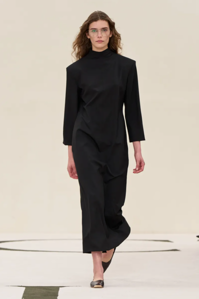 Да, на ней были skinny-джинсы с папиной рубашкой. Но это в 90-е. Сейчас же она предложила зрителям концепт «фасада»: одежда как функция, а не эмоция. Минимализм без надрыва, структура без истерики. Пальто, словно сшитые по плану урбанистического микрорайона. Платья — как вечные студентки-отличницы: гладкие, молчаливые и слегка угнетённые.