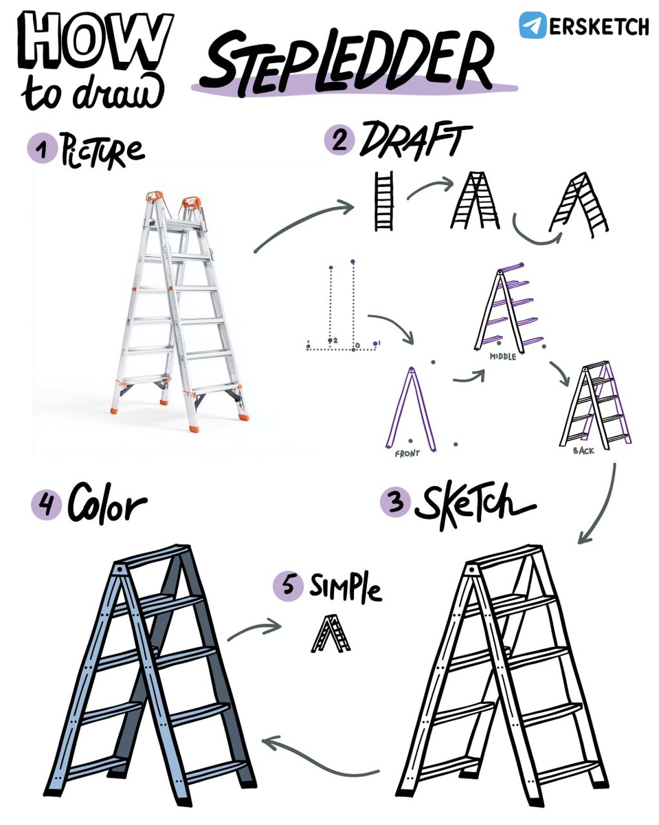 #HowToDraw #WSC2025 №30 Сегодня будем рисовать стремянку. Задача оказалась неожиданно сложной, так что соберитесь. Чтобы лестница получилась красивой, надо рисовать ее в проекции. И чтобы не пришлось стирать лишние линии, попробуем сделать это по слоям. Для начала нам нужно шесть точек, опираясь на которые мы будем рисовать. Представьте горизонтальную линию. Поставим точку на небольшом расстоянии над линией. Следующую точку поставим правее первой, а расстояние от линии у нее будет в два раза больше. Мы получили первую пару точек. Нужно ещё две. Вторую пару точек поставим правее первой и на одно "деление" ниже (третья точка будет лежать на линии, а четвертая будет от линии на таком же расстоянии, как и первая). Третья пара точек будет значительно выше первых двух по вертикали и ровно между ними по горизонтали. Должно получиться как на рисунке. Теперь начнем рисовать слои. Для левых точек из каждой пары нарисуем горизонтальную линию. Теперь края нижних линий соединим с верхней. На п