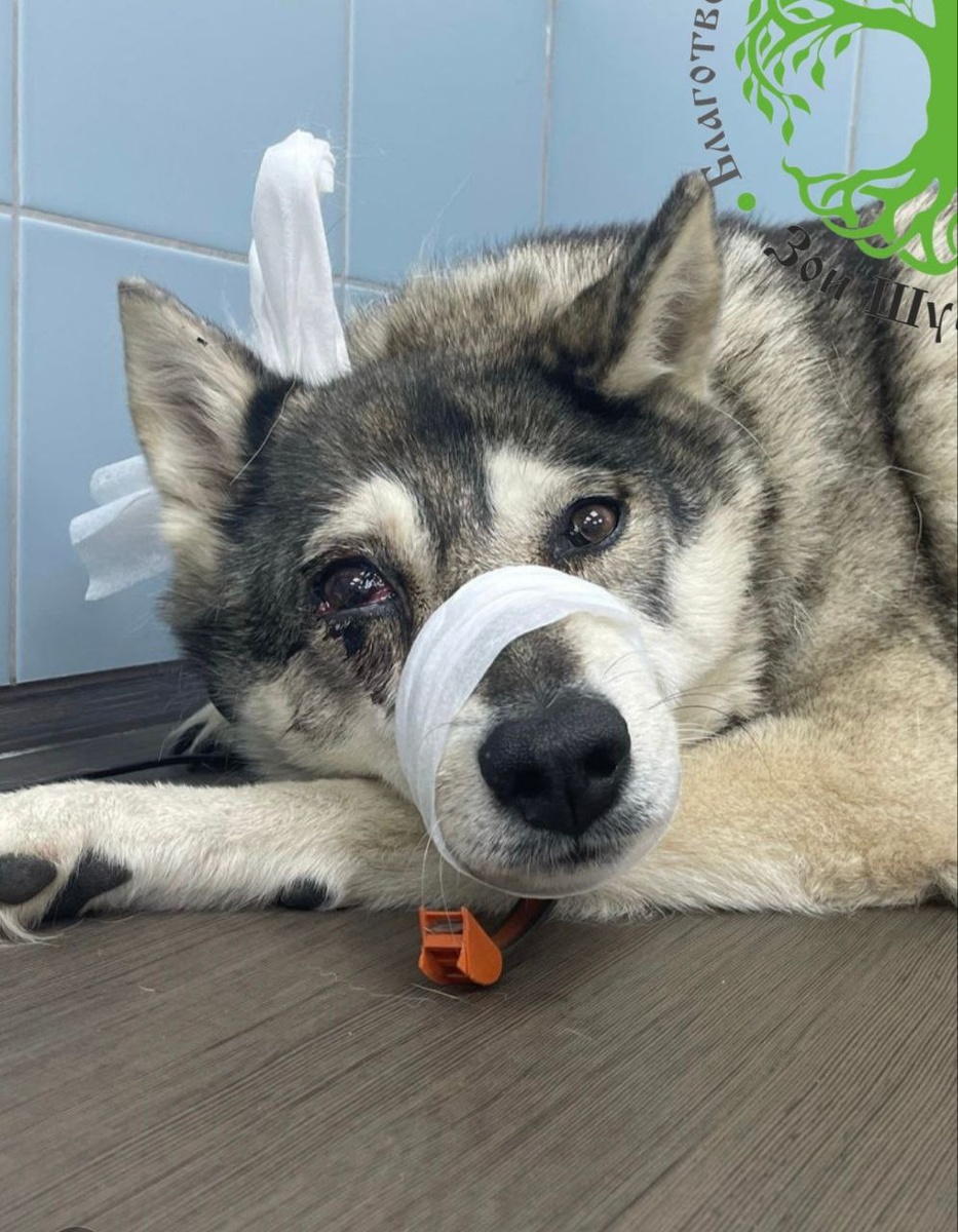 Сейчас собака находится в стационаре клиники ,,Белый Клык,, в крайне тяжёлом состоянии, у неё разбита параорбитальная кость, разрыв век, гематомы по всему телу.