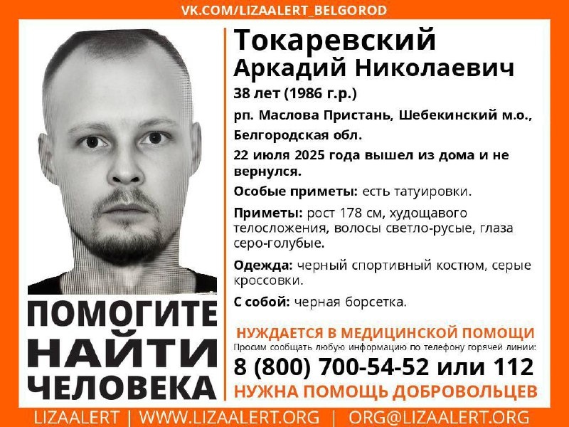 Пропал человек! Токаревский Аркадий Николаевич, 38 лет. Н.п. Маслова Пристань, Шебекинский район. 22 июля 2025 года вышел из дома и не вернулся. Если вы обладаете какой-либо информацией о пропавшем, просьба позвонить по номеру телефона горячей линии отряда 88007005452 (бесплатно по РФ) или 112. ❕ Жесть Белгород - подписаться