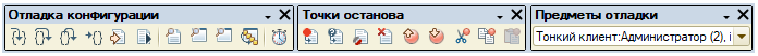 Для работы с «Отладчиком» используется пункт меню «Отладка» и панели инструментов: «Отладка конфигурации», «Точки останова» и «Предмет отладки».