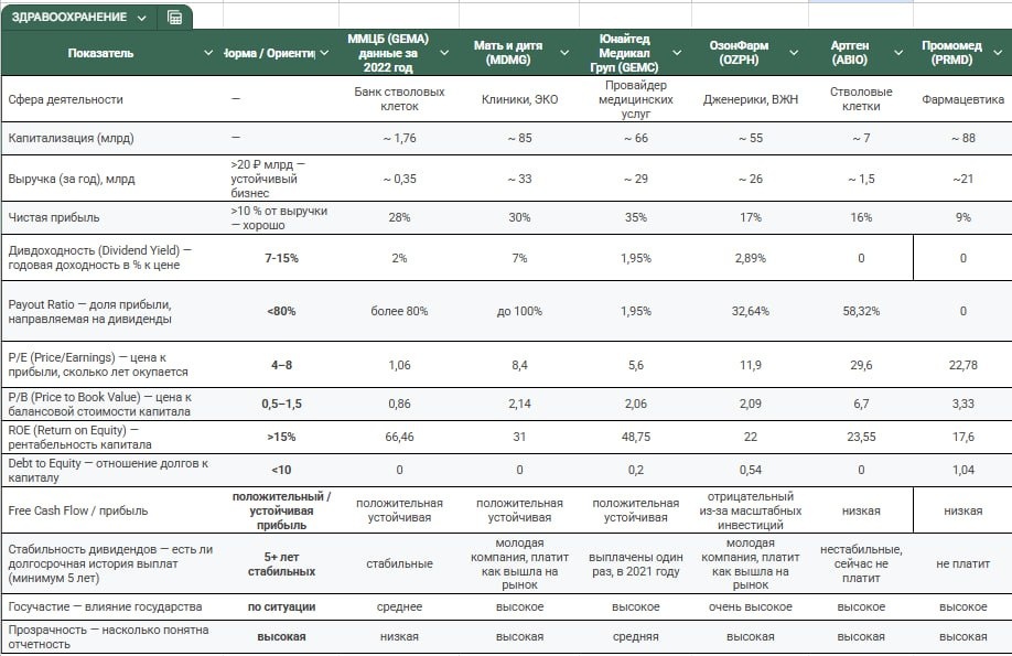 Мой портфель требует нового жильца, и в этот раз я решила заселить туда кое-кого из сектора здравоохранения. Да-да, теперь у меня будут не только нефтяные магнаты и финансовые мастадонты, но кто-то из таблеток, шприцов и биотехов. На самом деле, выбирать акции в здравоохранении — это как искать хорошего врача. Важно не только, чтобы не слишком дорого, но и чтобы лечил, а не "заклинал чакры". Так что забываем "куплю, потому что дешево" — это путь к инвесторскому гастриту. Смотрим, насколько ровно дышит компания, сколько зарабатывает, есть ли у нее пульс и не прячется ли отчетность где-то в архиве Минздрава. Любителям чисел — жамкайте на табличку. Там как в аптеке, все по полочкам: нормы, отклонения и побочные эффекты каждой компании. Короче, устроила "битву медицинских гигантов и гигантенков". Наслаждайтесь ) Кто просто хочет узнать, какой итог — краткий диагноз:👇 ✔️ ММЦБ (GEMA) — надежный биотехнический актив. Как Айфон среди акций. Дорого, стильно, модно, но иногда непонятно, за чт